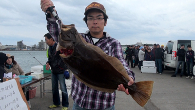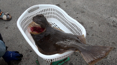 | 二匹で約五kg70センチの兆寸、運命の分かれ目です。そして次々と運ばれてくる魚に混じって外道ではありますが72センチのヒラメを筆頭に |