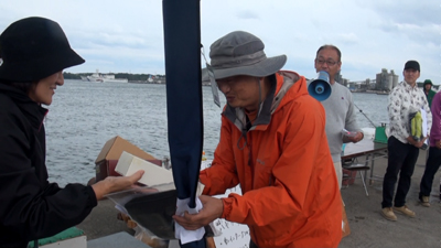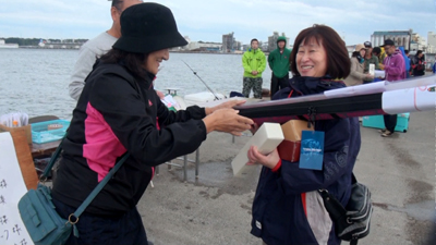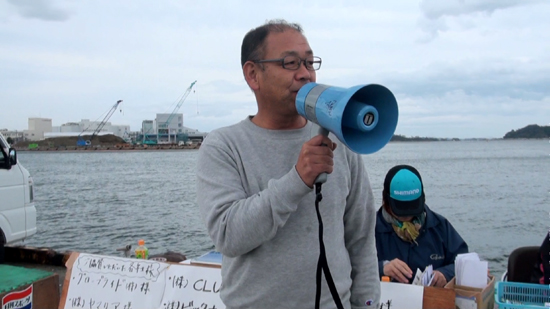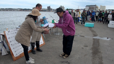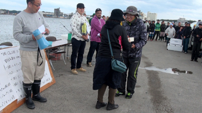 | えびす屋釣具店の伊藤栄明さんが「結果発表〜!」、ご協賛頂いた皆様ありがとうございました〜。 |
