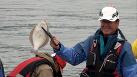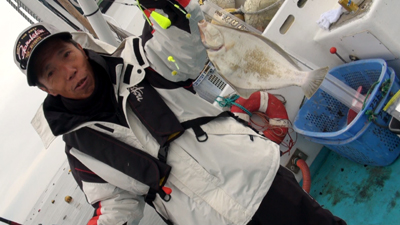 | 心配はよそに次々と揚がるマコガレイ、サイズは大小あるものの、釣り人もいい笑顔になって参りました〜!、本部船もたまらず「釣っぺ早ぐ〜」・・by池田正義! |