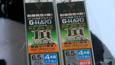 参加賞として配られた「頂(いただき)」、がまかつが誇る超高硬度・超高強度素材「G-HARD」に究極の低摩擦表面処理「ナノスムースコート」を施した鮎鈎、