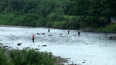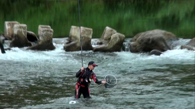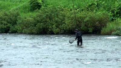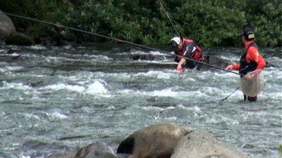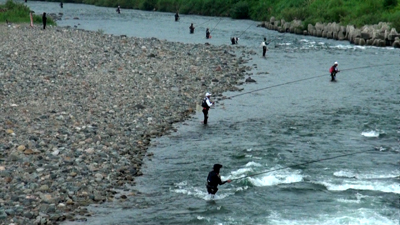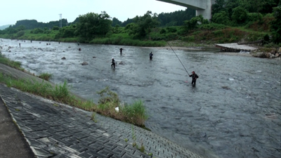 | 大会本部前”一の関大橋”上下に散らばる選手達、・・・まずカメラは最上部の選手のタモ入れを目撃! |
