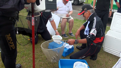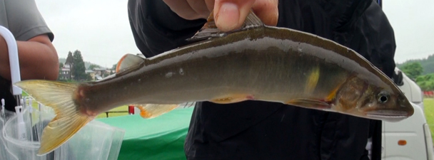 | 観客の目の前で引き抜かれるアユ、選手達の技の集大成である。 |