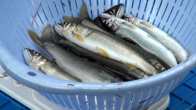 | 釣れ始まりが少々遅かったのにもかかわらず香り高いアユがタモの中で踊っております。 |