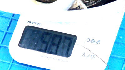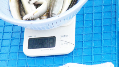 | 三時間で21匹、場所は”一の関大橋”下流部一直線対岸に向けての中央部、 真剣に見つめる先は・・・計量の数字です、587g (同数の場合は重量での勝負です) |