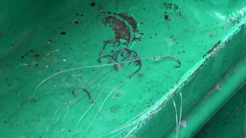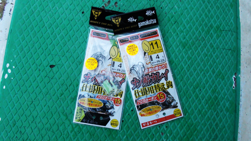 彼の手返しの早さのカギはこれ、ガンネルの棚にはがまかつ”ナノ船カレイ・仕掛け用替え鉤”が10本程置かれておりました。