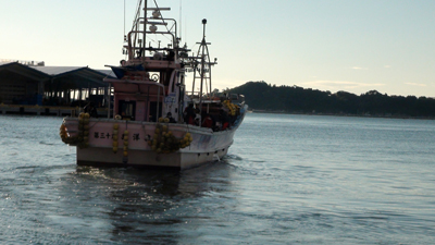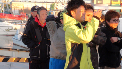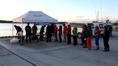 | 塩釜港はまがき桟橋にはこの日だから再会できる「いつもの顔」が列を作って船割り席割りの抽選を行っております。 |