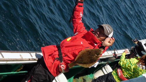 | 二つ目のポイントからアタリが見え出した大会本部船、同乗した東北のがま親分こと”池田正義”さんも大型マガレイに大興奮! |