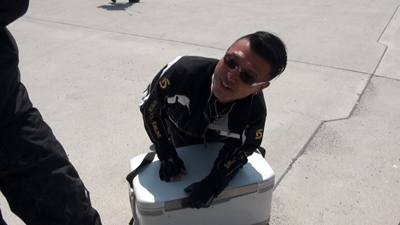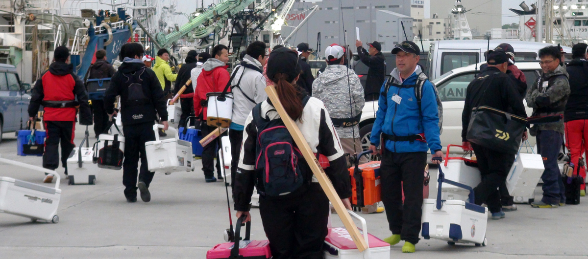 | 抽選にて決定した船へ急ぐ選手達、乗船前にはクーラー内部を大会役員が確認するという、厳格なルールの大会なのです。 |