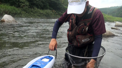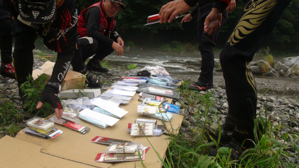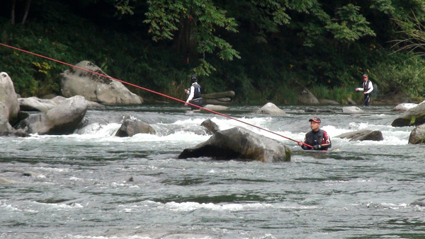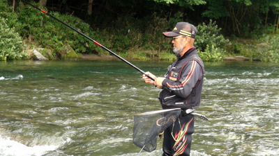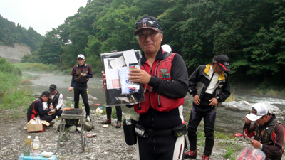 去年からGFGに入会した 庄子裕太 君(21才)、鮎釣りは高校時代からとか、彼も「がま鮎 競技GTI引き抜き急瀬」を使用、さて目印はいつぶっ飛ぶのか〜! |