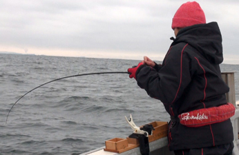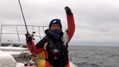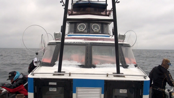開始直後はアタリは遠かったものの、船長の言葉通り・・水面を割る良型が釣り人の寒さを吹き飛ばしたようです。 |