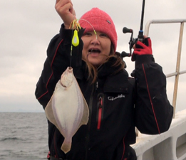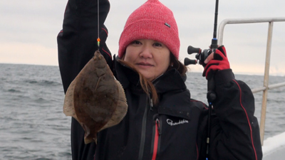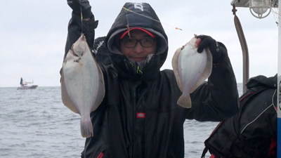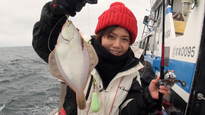 | 太田ゆう子さんは、がま船「カレイ一爽」で・・「おっ、ゆうちゃんも曲がってんじゃないの〜」、「なんだや、両天秤使ってたんだっちゃ〜!」 |