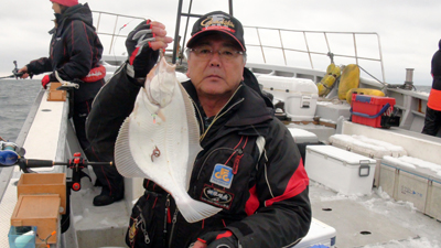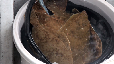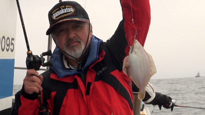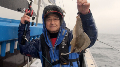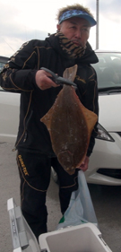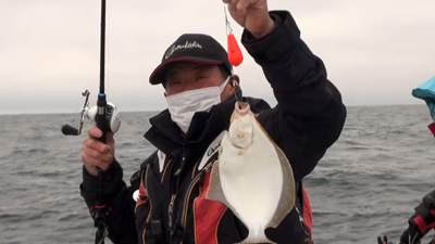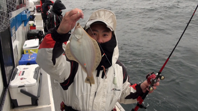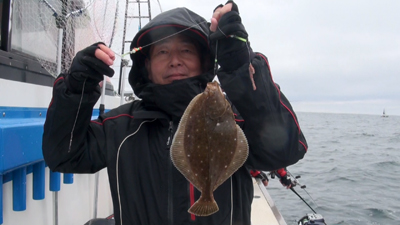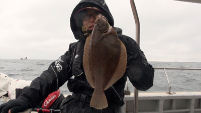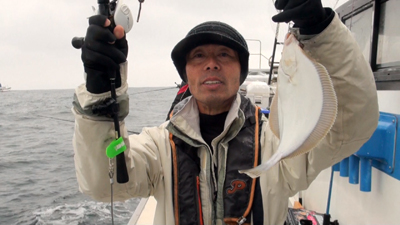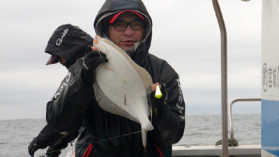 | 早速、土井俊光さんがお試し〜、がま船「鰈幻粋」の超高感度とあいまって大型マガレイげっっと〜! |