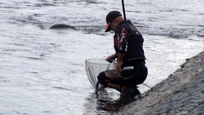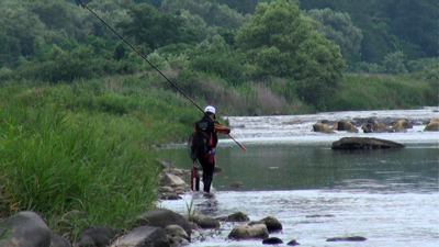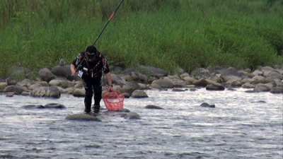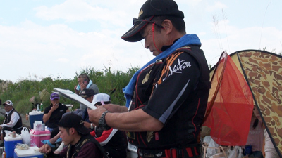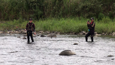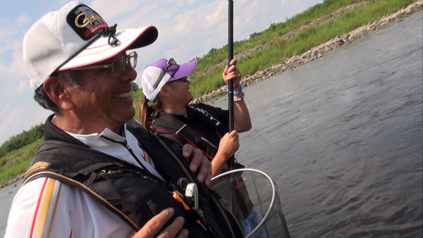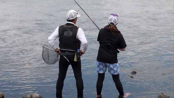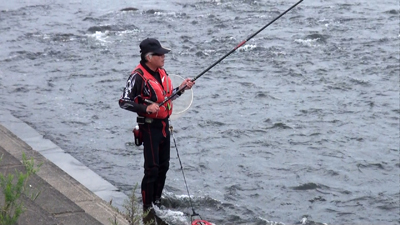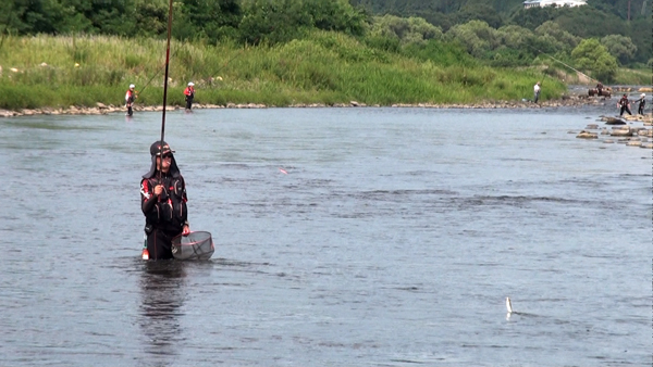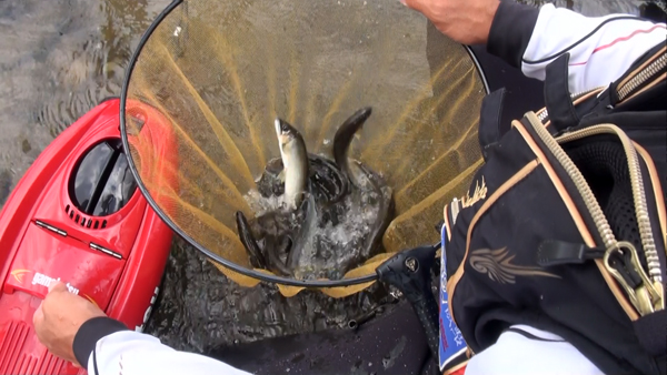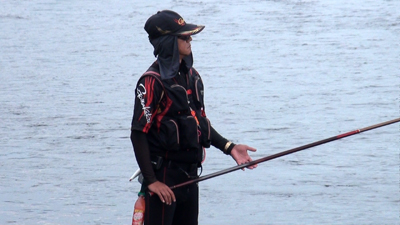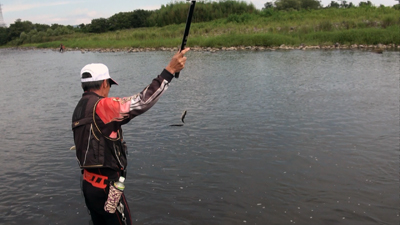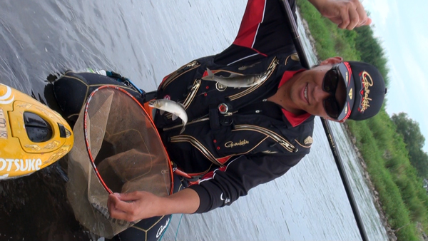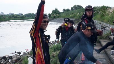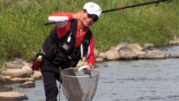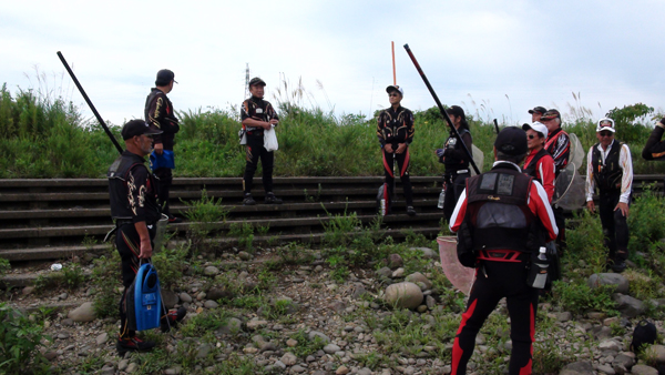 | 水位が低い事もあり「泳がせ釣り」がメイン、選手達のほど良い散らばり方が取材班にはラッキーなのでありました。 |