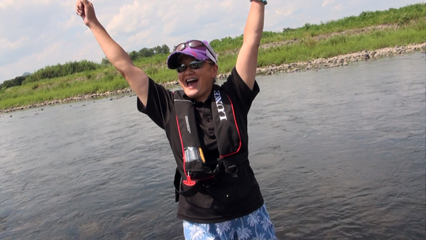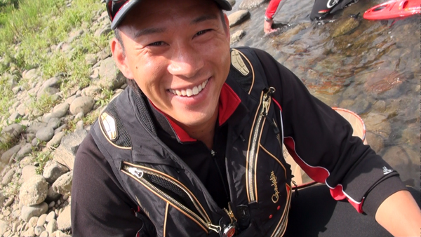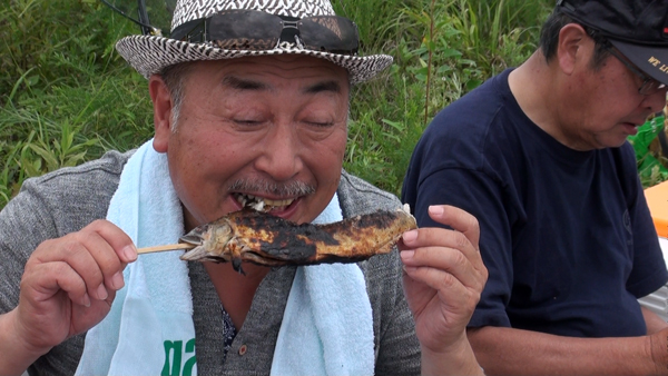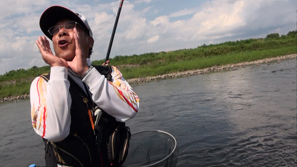 | こちらは本部長の平 吉明さん、上流に泳がせるとすぐに掛かりました、しぇがかり〜! |