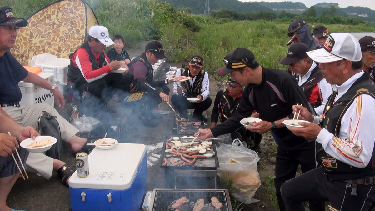 今回の懇親会は地元河川と言うこともあり、鮎釣りを見学したいという「海釣り派」もBBQ参加で、競技が終わる1時間前のAM10:00にじわじわ集合・・