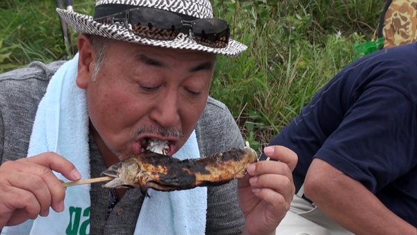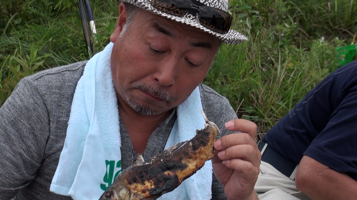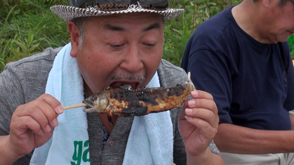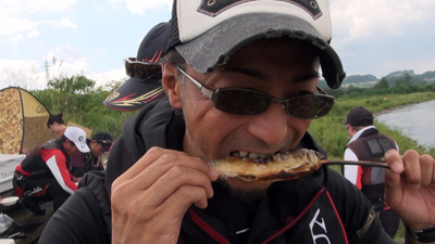 | 一方、「料理評論家 土井」の肩書きを持つ土井さんは、でっかい鮎の塩焼きを手に取り |