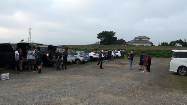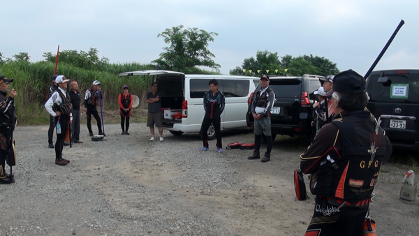| 近況の談義に花を咲かせながらも、「そろそろやるすぺ〜」で・・オトリ鮎も配られ 各々が思う場所へ散らばります。 |
