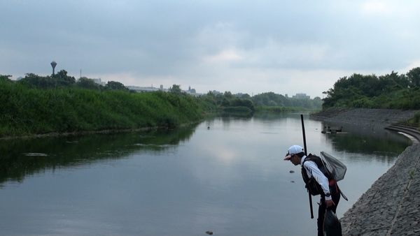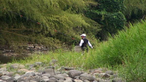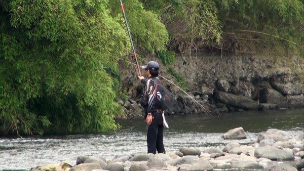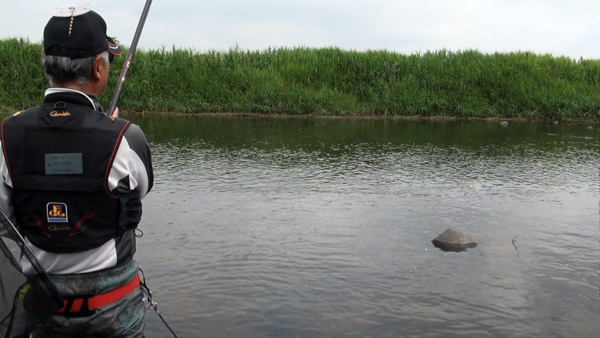 | さて「階段テトラ」を離れて下流部に目を移すと、地元で「名取川の杭」と呼ばれる小原さんが対岸の繁み際を攻めております。 |