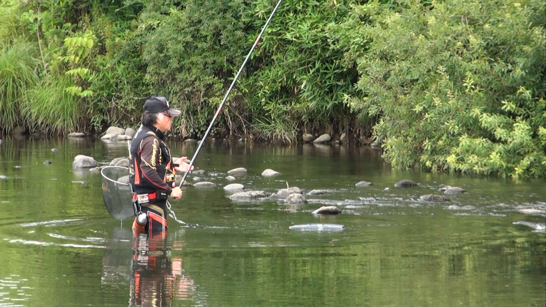 | そして再び上流部に振り返ると・・・、そこには三匹目を取り込んだ小原さんの不適な笑みがありました・・。 |