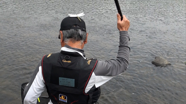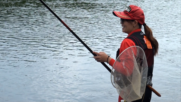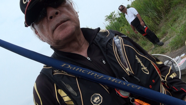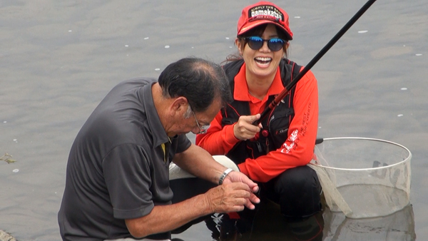 | 高埼さんは慣れない長竿9.5mに戸惑いを隠せません。 |