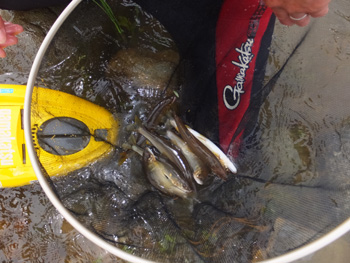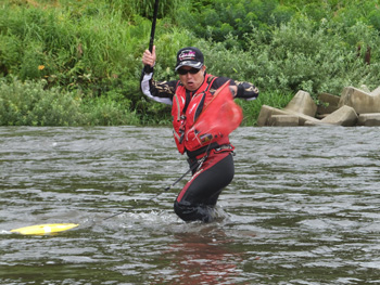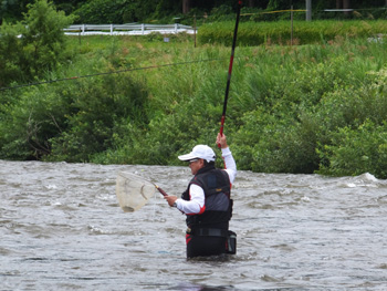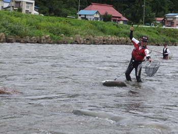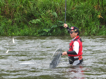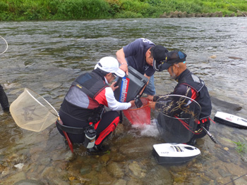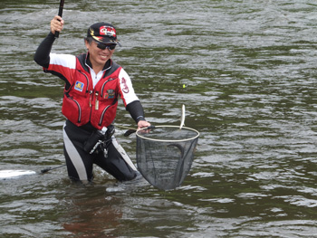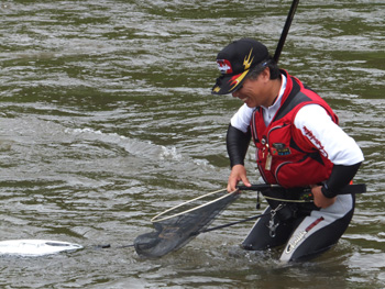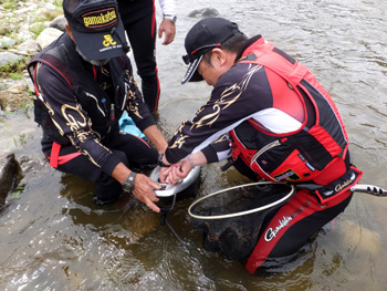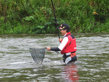 | 流れに立つ内水面担当の加藤さん、水かさは増しておりま〜す、気をつけてくださ〜い! |