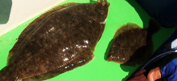 なんの!、開始早々身の厚いマコガレイが上がってくるではないですか、しかも〜ダブルだ!動画でこの興奮をアナタも・・・。