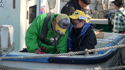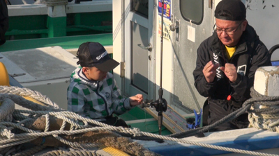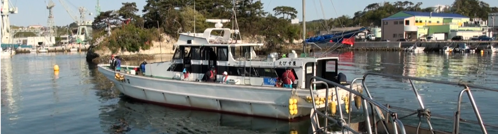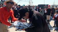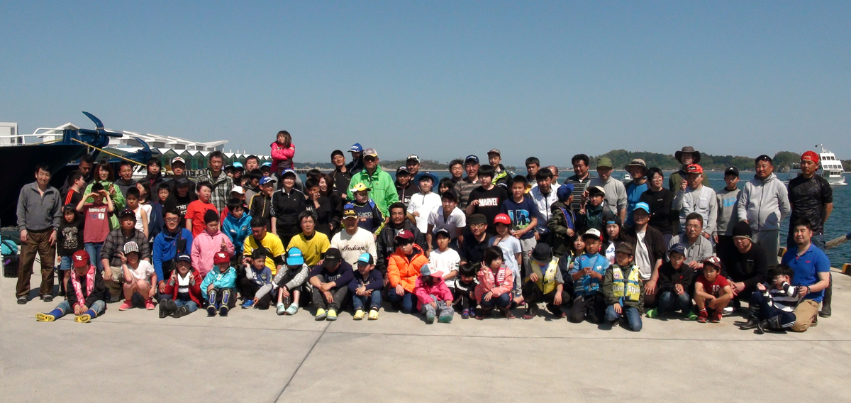 | 快晴の塩釜港まがき桟橋には、ゴールデンウィーク終盤のイベントにお父さんの威厳を賭けたカレイ釣り本格派も見受けられます。 |