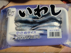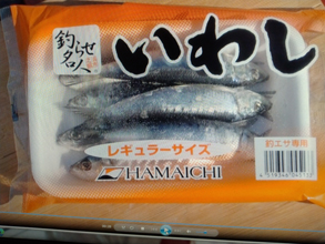 ※エサについて:参考までに取材班が使ってみた冷凍イワシのパッケージです。 |
