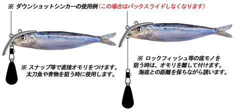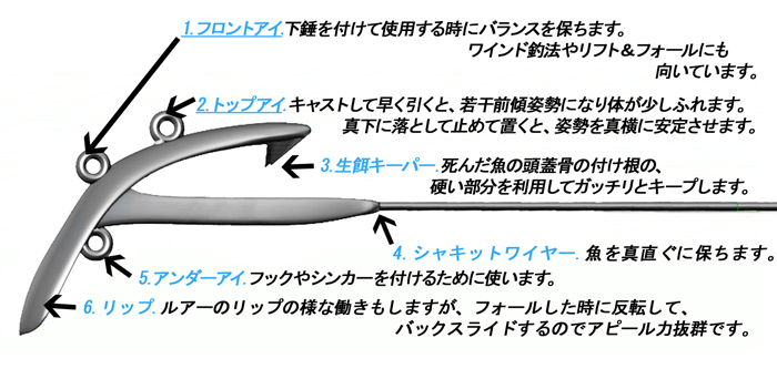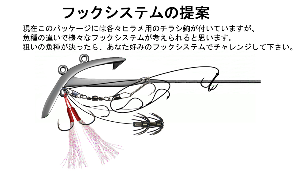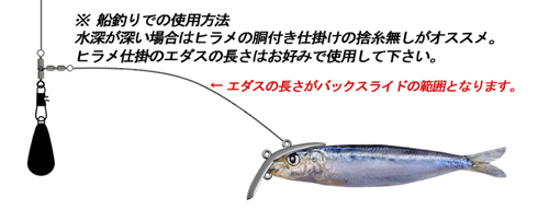 | ※オカッパリや浅場のボートでの使用方法は、ルアーと同じく 直接フロントアイ又はトップアイにお好みで取り付けて使用して下さい。 |